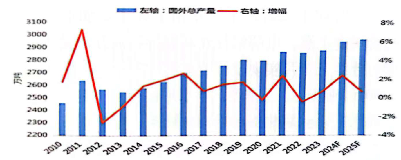 安泰科統(tǒng)計,截至2024年底,全球電解鋁總生產能力7886萬噸/年,其中國外產能合計3424萬噸/年,與上年持平;2024年全球電解鋁產量約為7296萬噸,較上年增加3.5%;其中,國外電解鋁產量為2950萬噸,同比上漲2.4%,占全球總產量的40.4%。