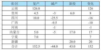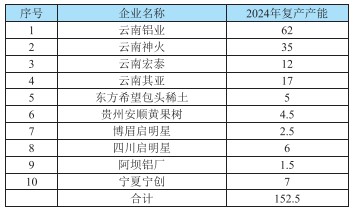 表2-2 2024年中國電解鋁復產產能變動情況(萬噸/年)