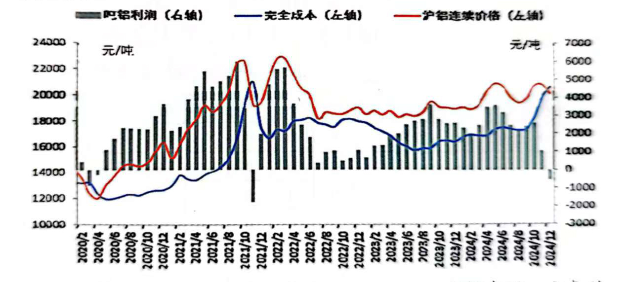 2024年,盡管氧化鋁價格大幅波動導致電解鋁成本重心明顯抬升,但從全年來看,鋁價持續(xù)高位運行,電解鋁行業(yè)依舊維持2000元/噸以上的利潤,尤其是在5月份,利潤達到3581元/噸的年內最高水平。根據安泰科測算,2024年中國電解鋁加權平均完全成本(含稅)為17717元/噸,同比增加7.4%或1223元/噸;全年噸鋁平均利潤約為2227元,同比增加0.9%或20元。
