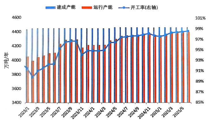 2025上半年,中國(guó)鋁行業(yè)生產(chǎn)總體較為穩(wěn)定,沒(méi)有出現(xiàn)因各種不可抗力因素導(dǎo)致的規(guī);瘻p產(chǎn),且隨著四川、貴州、青海等省/區(qū)電解鋁企業(yè)的復(fù)產(chǎn)和新建項(xiàng)目投產(chǎn),上半年生產(chǎn)能力得到持續(xù)提升。安泰科統(tǒng)計(jì),截至2025年6月底,中國(guó)電解鋁建成產(chǎn)能4470萬(wàn)噸/年,其中運(yùn)行產(chǎn)能4405萬(wàn)噸/年,較2024年底增加49萬(wàn)噸。1-6月份產(chǎn)能利用率達(dá)98.1%,不斷刷新歷史新高,比去年同期高2.4個(gè)百分點(diǎn):其中6月份產(chǎn)能利用率達(dá)98.5%,較2024年末高0.9個(gè)百分點(diǎn)。2025上半年,中國(guó)電解鋁產(chǎn)量約為2184萬(wàn)噸,同比增加2.4%。