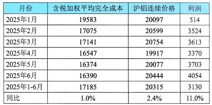 表1-2 2025上半年中國(guó)電解鋁成本和盈利情況