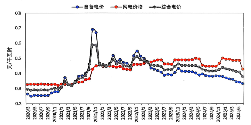 電力成本下降。截至6月底,中國(guó)電解鋁運(yùn)行產(chǎn)能中的自備電比例約55%;網(wǎng)電比例約45%。煤炭?jī)r(jià)格的持續(xù)下滑導(dǎo)致鋁企自備電價(jià)降低是2025年以來(lái)電解鋁行業(yè)電力成本下降的主要原因。2025年以來(lái),煤炭主產(chǎn)區(qū)煤礦復(fù)產(chǎn)節(jié)奏加快,進(jìn)口煤到港量維持高位;而電煤因暖冬影響需求疲軟,非電行業(yè)又處于淡季,煤炭供應(yīng)寬松但需求疲軟,導(dǎo)致煤炭?jī)r(jià)格呈下行態(tài)勢(shì),鋁廠自備電價(jià)逐步下跌。此外,廣西、云南、四川等地區(qū)網(wǎng)電價(jià)格均有不同程度的下調(diào),進(jìn)一步促進(jìn)了鋁企電力成本的下降。根據(jù)安泰科統(tǒng)計(jì),2025年6月份自備電加權(quán)平均價(jià)格為0.332元/千瓦時(shí),較2024年末下降0.048元/千瓦時(shí),較2024年同期下降0.065元/千瓦時(shí);網(wǎng)電價(jià)格為0.428元/千瓦時(shí),較2024年末下降0.074元/千瓦時(shí),較2024年同期下降0.0276元/千瓦時(shí);綜合加權(quán)平均電價(jià)為0.379元/千瓦時(shí),較2024年末下降0.0507元/千瓦時(shí)。1-6月份綜合加權(quán)平均電價(jià)為0.414元/千瓦時(shí),同比下降0.034元/千瓦時(shí)。